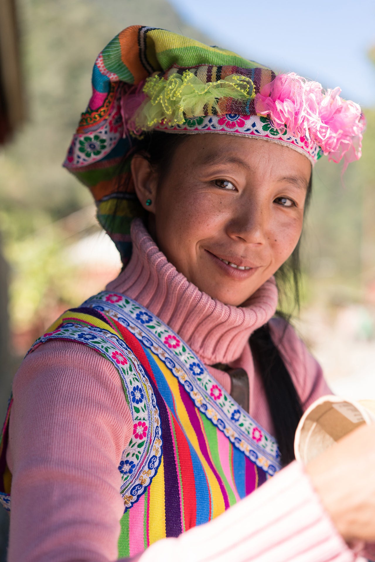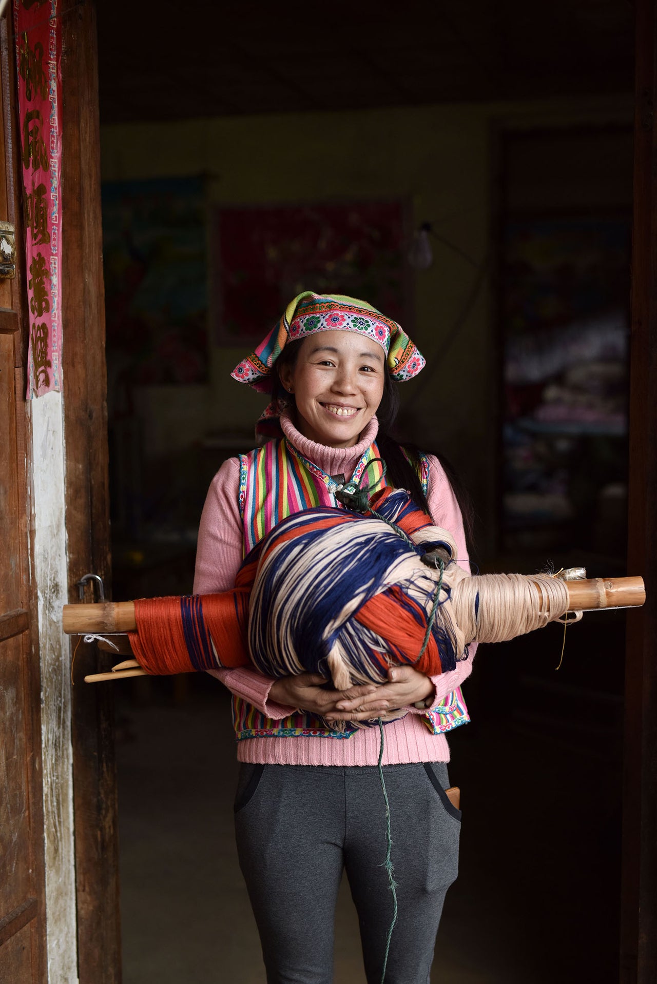 "In my spare time, I weave fabric. When I weave, it's with friends and family because it's more fun with companions. I like using rainbow colors when I weave."