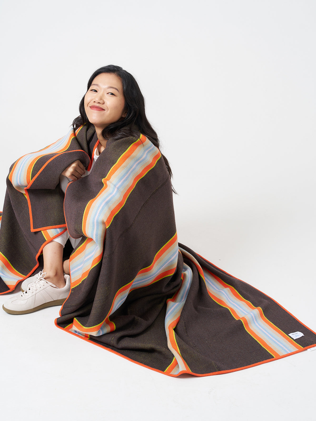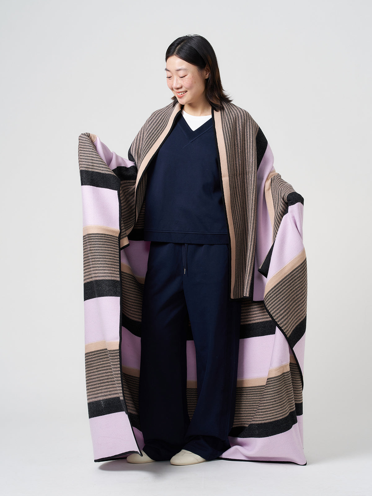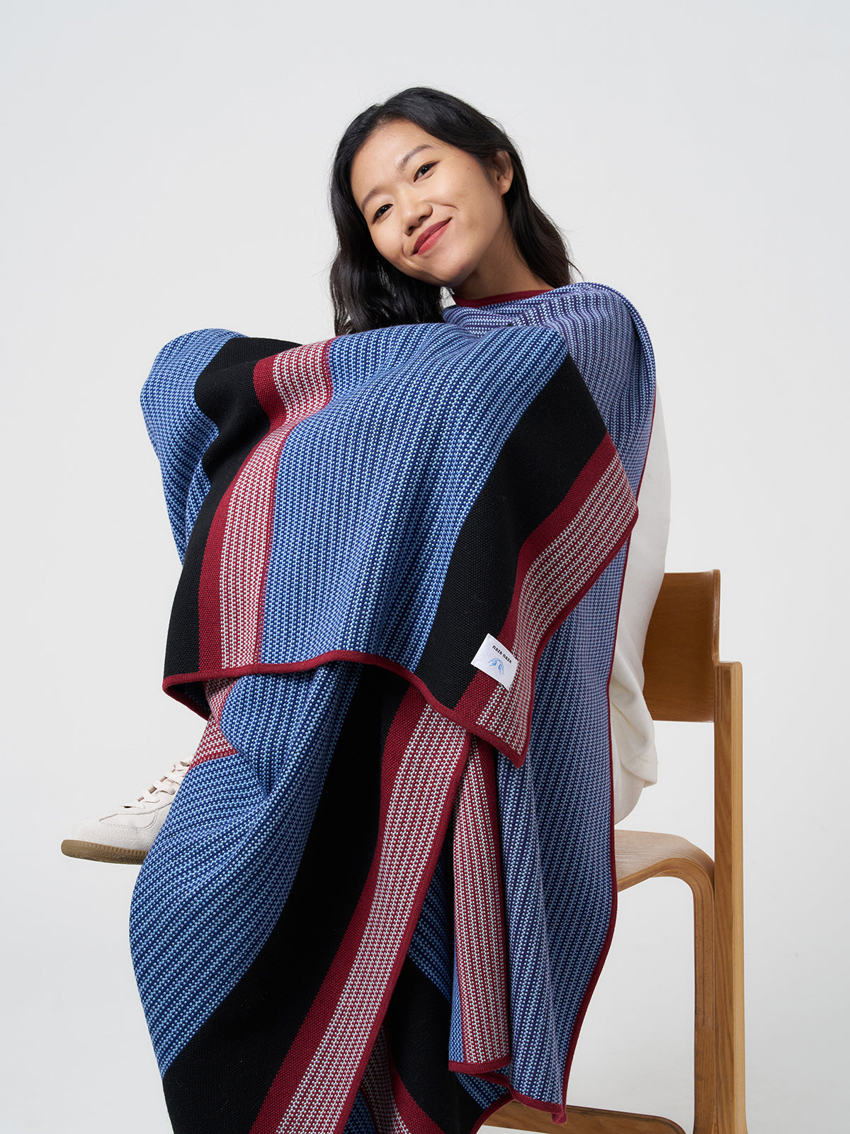 The large blanket is perfectly sized to fit a standard double bed. Its simple yet refined four-needle six-line flat-knit technique ensures durability and elegance. The high-quality wool yarn is gentle enough for close contact with the skin, providing extra warmth for cold winter nights. The vibrant color palette adds an atmospheric touch to your home, brightening up the entire room.
